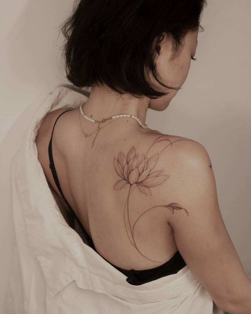 Lotus flower tattoo in illustrative style located on the shoulder blade. Source